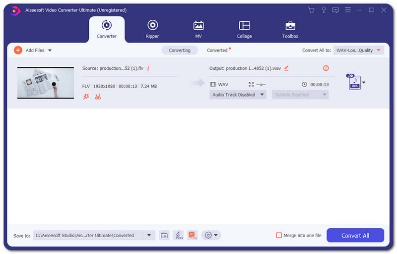 In terms of the best desktop version for the converter, Aiseesoft Video Converter Ultimate will belong on the list. This converter will allow you to convert FLV to WAV format with a smooth process. Furthermore, this all-in-one converting software offers an advanced technology that provides a fantastic converting experience. Thus, converting files with a second will be possible with Aiseesoft Video Converter Ultimate. Not to mention its extra features, which include a metadata editor for your video or audio files, an essential editing tool for cropping and trimming your files. There is more to offer; get it now to explore and experience your multiple files' professional and efficient conversion with Aiseesoft Video Converter. Moreover, are we not convinced yet, that this converting software will not be a regret utilizing our grind.