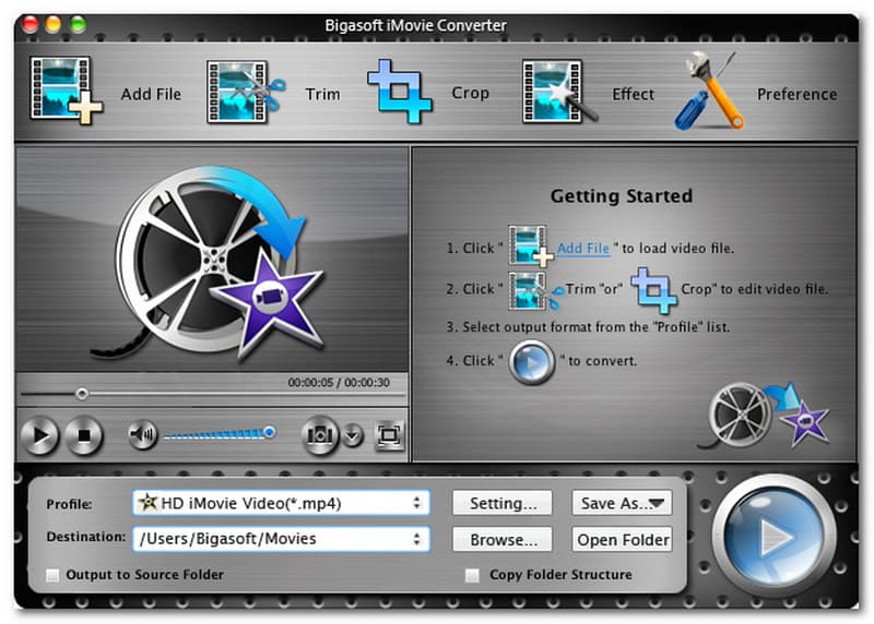 Bigasoft Total Video Converter is another converting tool that possesses professional converting features and functions nowadays. This converter will allow you to convert any files, even the formats that come with high codecs. Furthermore, it also offers features that you can do regarding transforming your iMovie to MP4 file formats. That includes the preview features to play your files. In addition, essential editing tools like trimming footage and more. Check this converter to discover what it can offer more.