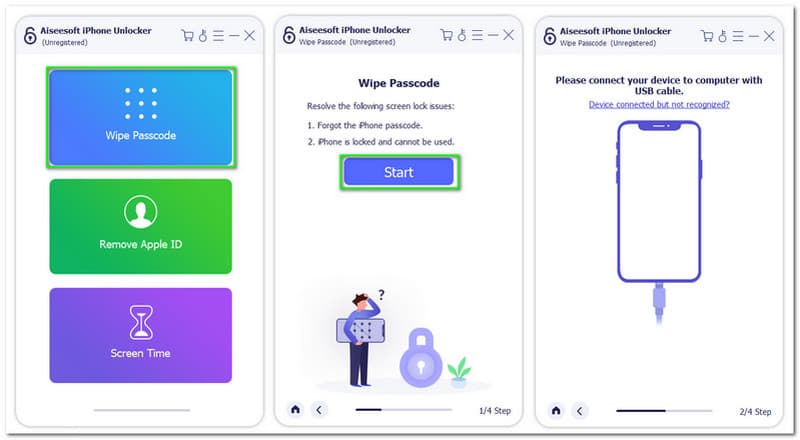 The first fantastic unlocking tool we can use as an unlocking tool for iPhone 6 and up is Aiseesoft iPhone Unlocker. This software possesses the outstanding feature of opening our iOS devices with confusing steps and procedures. It can give us the Wiping Passcode tool, which can alleviate any type of passcode within your iOS device. Also, it can remove your Apple ID account for changing phone purposes, selling your iPhone, and more. Also, it has a practical feature for unlocking Screen Time that can help us retrieve passcode restrictions. That is only the overview of its features. You can discover more by getting it for free with their official web page.
