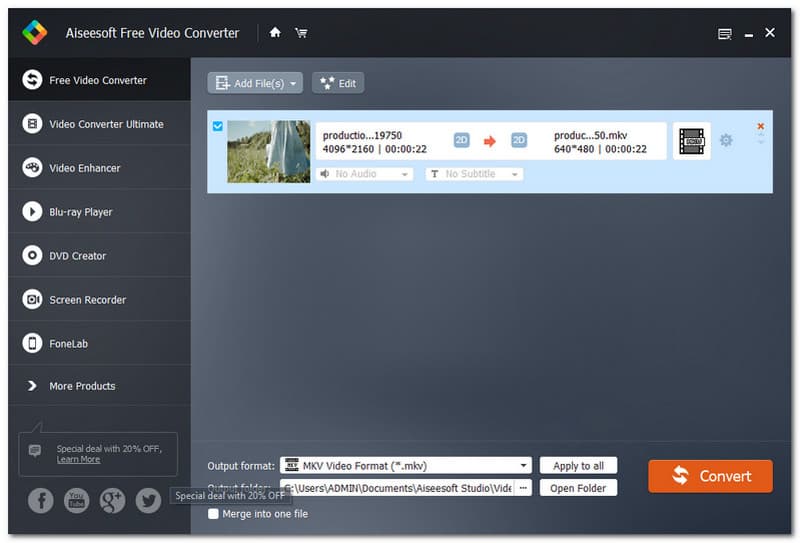 Find an RMVB to MKVconverter that must contain key features. For example, Aiseesoft Free Video Converter supports multiple file formats, and it has editing tools, converts so fast, has batch conversion, and a lot more. You can visit Aiseesoft Free Video Converter and try it for free.