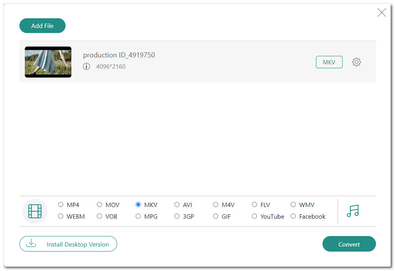With AnyMP4 Free Online Video Converter, you can import over 300 formats and convert them into the format you like. For example, you can convert your RMVB file to an MKV file extension effectively! Additionally, AnyMP4 Free Online Video Converter is a video converter and an audio converter that enables you to change into MP3, AAC, AC3, WMA, WAV, AIFF, FLAC, etc. MKA, M4A, M4R, and a lot more. Apart from that, it lets you extort the background music from your video file and procure them for loop playback on your player.