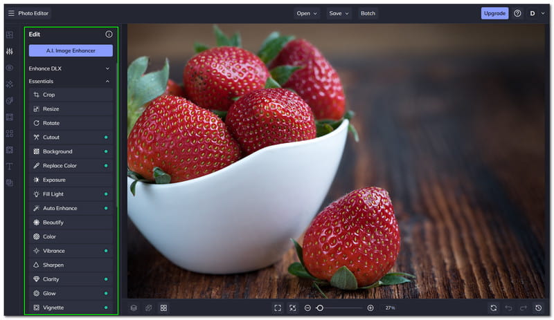 Kromě toho vám BeFunky umožňuje vybrat si, co chcete dělat; můžete si vybrat Správce obrázků, Úpravy, Retušování, efekty, Umělecké, Rámečky, Grafika, Překryvy, Text, a Textury. Jelikož se zaměřujeme na úpravu fotek, nabízí BeFunky Oříznout, Změnit velikost, Otočit, Vyjmout, Odebrat pozadí, Nahradit barvu, Expozice, a mnoho dalších.