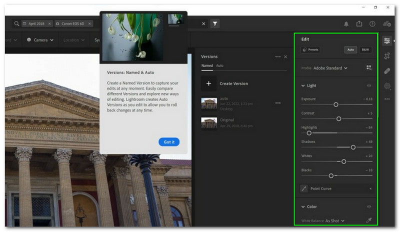 Navíc na Upravit část, uvidíte Předvolby, Auto, a Černý a bílý. Můžete si také vybrat a Profil jako Adobe Standard a více. Níže jsou uvedeny základní nástroje pro úpravy, jako např Světlo: Expozice, Kontrast, Světla, Stíny, Bílá, a Černá. Uvidíte také Bodová křivka, barva, atd. a pro své fotografie můžete použít všechny zmíněné nástroje.