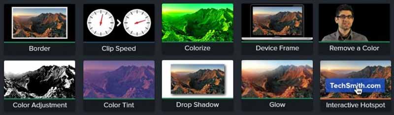 For at redigere de optagede videoer har Camtasia forskellige effekter til videoer, lydfiler og tekster. Du kan tilføje kantramme, kliphastighed, justere farver, farvelægge videoerne, skygge og mere til videoerne. Selvfølgelig giver det dig mulighed for at komprimere lyd, reducere støj, anvende fade-in/fade-out-effekter eller klipshastighed. Inden for Camtasia kaldes disse adfærd og kan anvendes på tekst eller videoklip.