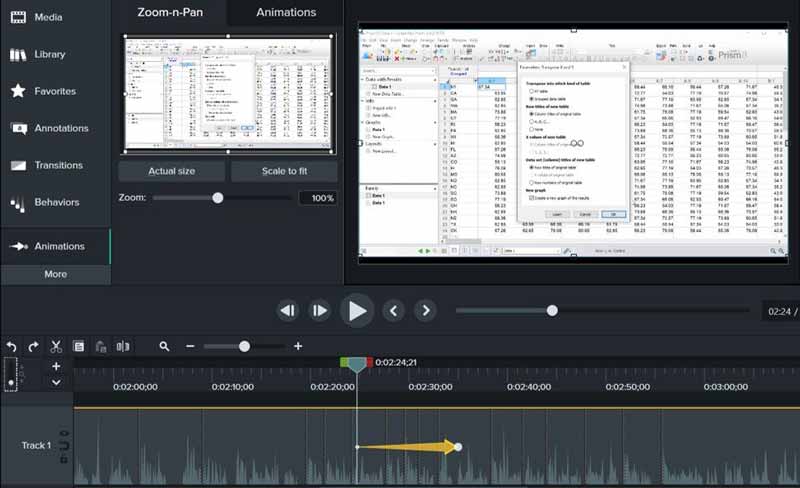 Du kan også finde snesevis af videoanimationer i Camtasia. Men når du skal have en præsentation til dit publikum, bør zoom og panorering være en af de bedste animationer, du kan tage med i overvejelserne. Det vil ændre størrelsen og placeringen af det lille rektangel i miniaturebilledet