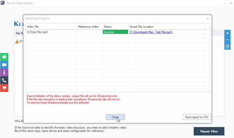 Efter afslutning af reparationsprocessen vil appen indikere, at den er vellykket. Nu hvor videoklippet er blevet set, kan du nyde den intakte eller ubeskadigede videofil.
