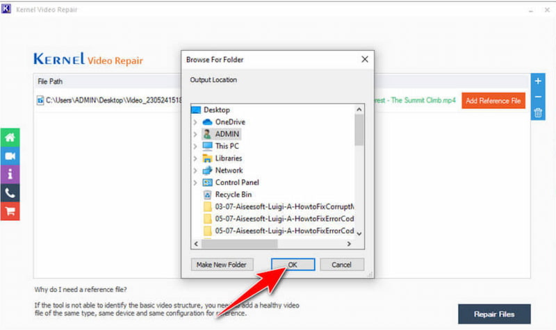 Derefter skal du klikke på Okay knappen for at bekræfte dit valg af filmappeplacering, hvor den reparerede fil vil blive gemt.