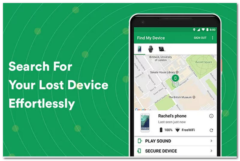 Googles Find My Device-app er en bemærkelsesværdig og brugervenlig gratis GPS-sporingsapp designet specielt til Android-enheder. Det giver brugerne mulighed for at finde deres Android-telefon, så længe målenheden er forbundet til internettet og let tilgængelig gennem dens tilknyttede Google-overvejelser. Præsentation af din telefons placeringskoordinater vil gøre findeprocessen meget nemmere.