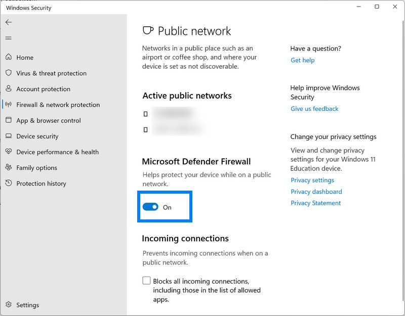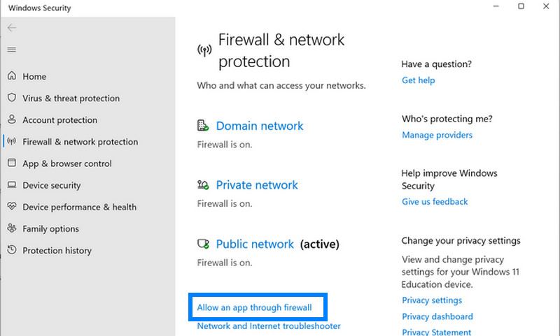 Vælg Windows sikkerhed og så Firewall og netværk beskyttelse.