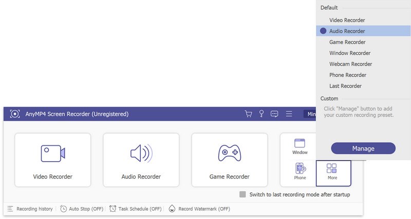 En af dens mest imponerende funktioner er, at den kan optage forskellige områder, herunder desktop, webcam, telefonskærm og gameplay. Den har funktioner, der passer til alle brugere. Hvis du ofte optager onlinemøder for at gemme vigtige oplysninger, kan du bruge Opgaveskema funktion til at garantere hver optagelse på en regelmæssig basis. Hvis du er en studerende, der normalt skal lave præsentationer eller dubbe, kan du samtidig optage dias og mikrofon til et perfekt job. Lad os sige, at du er en game influencer på sociale medier; du kan nyde øjeblikkelig deling på platforme efter optagelse med AnyMP4 Screen Recorder.