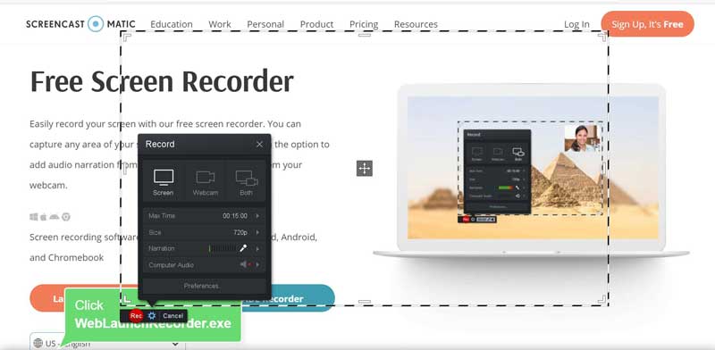 Μία από τις κύριες λειτουργίες του Screencast-O-Matic είναι η λήψη οθόνης. Σας επιτρέπει να εγγράφετε βίντεο στην οθόνη σας με μια οργανωμένη και απλή διεπαφή. Απλώς επιλέξτε την πηγή εγγραφής, συμπεριλαμβανομένης της οθόνης, της κάμερας web και των δύο, στη συνέχεια προσαρμόστε τη μέγιστη διάρκεια, το μέγεθος και τις πηγές ήχου για το βίντεο και επιλέξτε ακόμη και τον ήχο μικροφώνου και υπολογιστή ως πηγές ήχου.