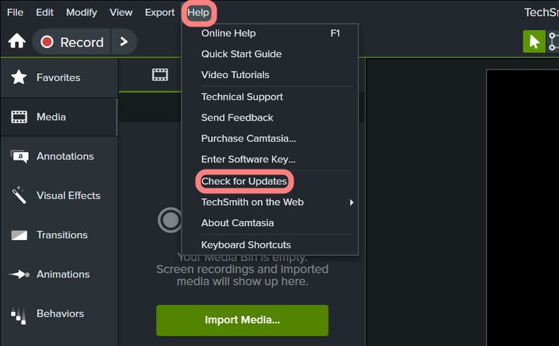 Si cela fait un certain temps que vous n'avez pas mis à jour votre logiciel Camtasia, il se peut qu'il ne soit pas compatible avec les derniers formats de codec de vos fichiers vidéo. Pour ce faire, vous pouvez cliquer sur Aider, sélectionnez Vérifier les mises à jour pour voir si la dernière version est disponible, puis suivez les instructions pour la télécharger.