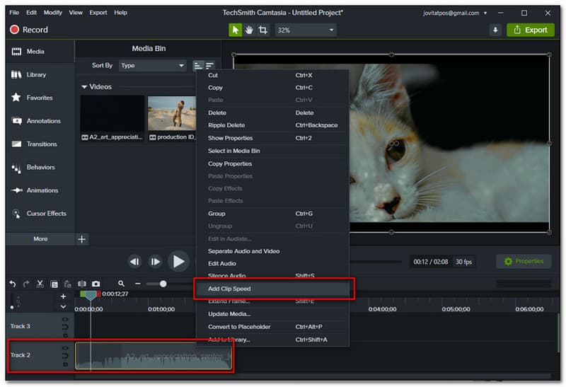 3. הדבר הבא שעלינו לעשות הוא ללחוץ לחיצה ימנית על וִידֵאוֹ על מַסלוּל. לחץ על הוסף מהירות קליפ.
