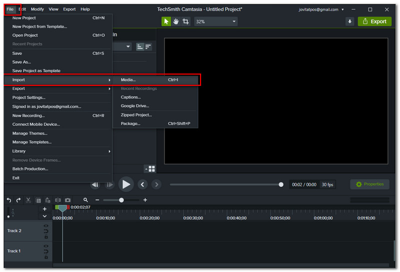 1. עבור אל קוֹבֶץ בחלק העליון של הממשק. משם, אתר את ייבוא מדיה כדי להוסיף את קובץ הווידאו שברצונך לחתוך.