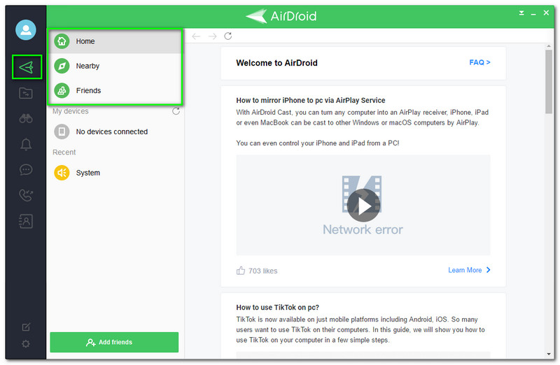 AirDroid के क्यूआर कोड के साथ, आप अपनी फ़ाइलों को पीसी से मोबाइल फोन, मोबाइल फोन से पीसी और किसी को भी वायरलेस तरीके से स्थानांतरित कर सकते हैं! बढ़िया, है ना? इसके अलावा, आप उस सुविधा को इंटरफ़ेस के बाईं ओर देख सकते हैं।