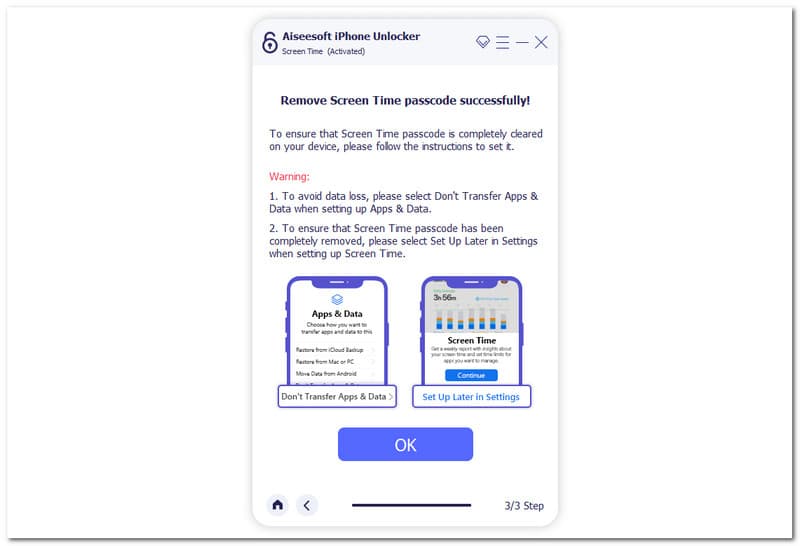 Egy új lap fog megjelenni. Innen már kattinthat az OK gombra. Kérjük, várjon, és hagyja, hogy az eszköz újrainduljon, mivel megkerüljük a képernyőidő jelszavát iPhone-ján.