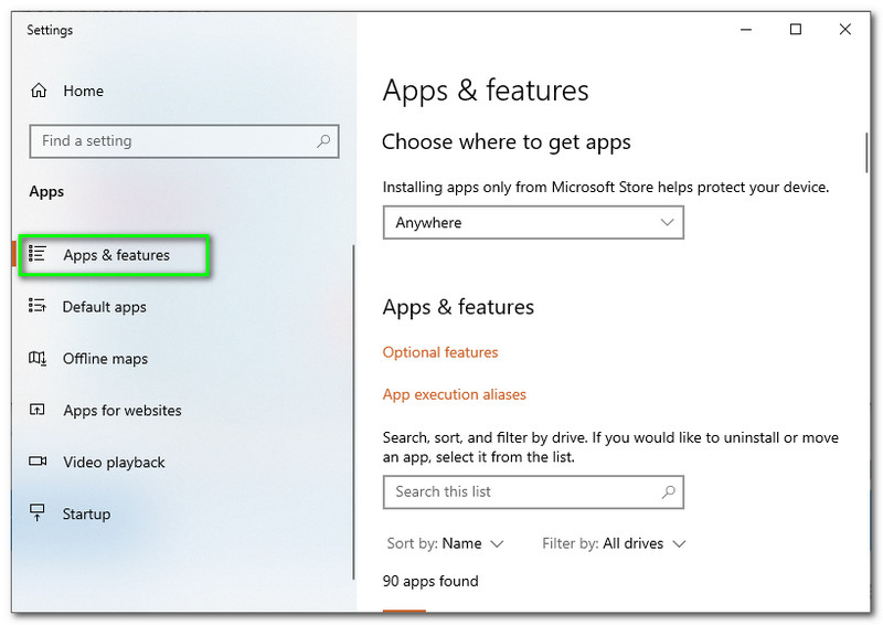 Buka anda Tetapan Windows pada komputer anda. Kemudian, pilih Apl dan Ciri di sebelah kiri panel.