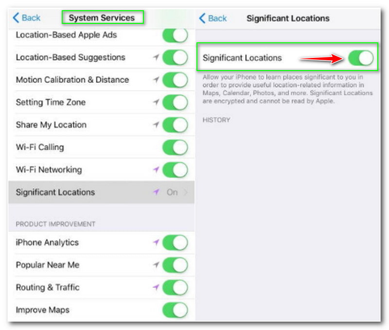 Deschide Setare aplicația de pe iPhone și derulați în jos pentru a vedea Confidențialitate. După aceea, treceți la Servicii de localizare iar apoi la Servicii de sistem. La derularea în jos, veți vedea Locație semnificativă și glisați butonul spre stânga pentru a opri Locații semnificative. În cele din urmă, selectați Sterge istoricul. Ceea ce se va întâmpla este că Apple va opri să vă urmărească și vă va șterge Istoricul locațiilor curat.