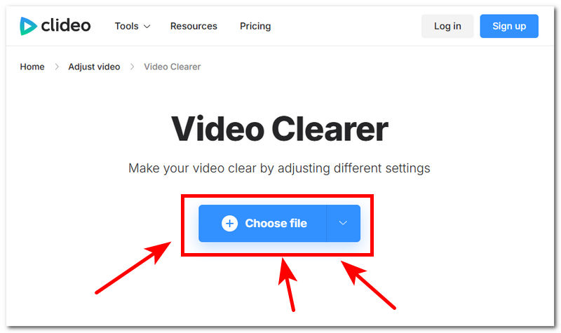 Go to Clideo’s official website to access their video-clearing online tool, click the Choose File button, and select the video you want to fix.