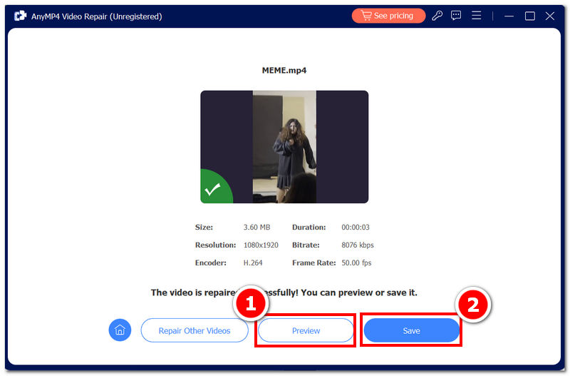 The software will repair the video automatically. Once you've seen that it is finished, you may click the Preview button to check if there are still parts in your video that need repair; once you are satisfied, click on the Save button to download your repaired video.