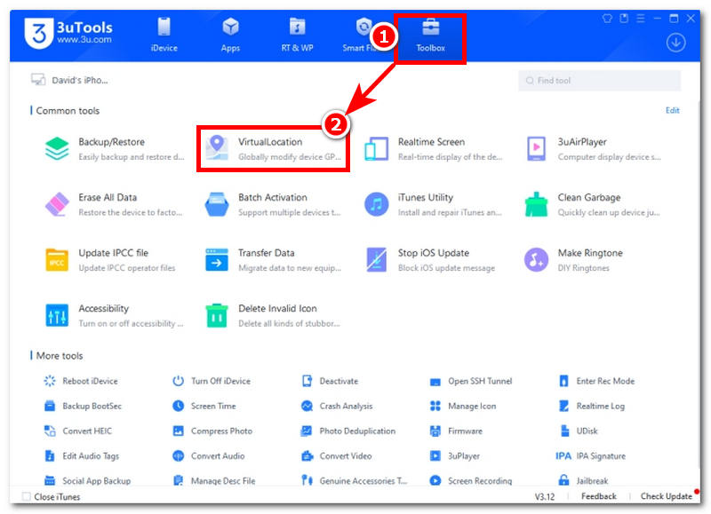 From the 3uTools main interface, click on the Toolbox button in the upper part of the software and then click on the Virtual Location tool.