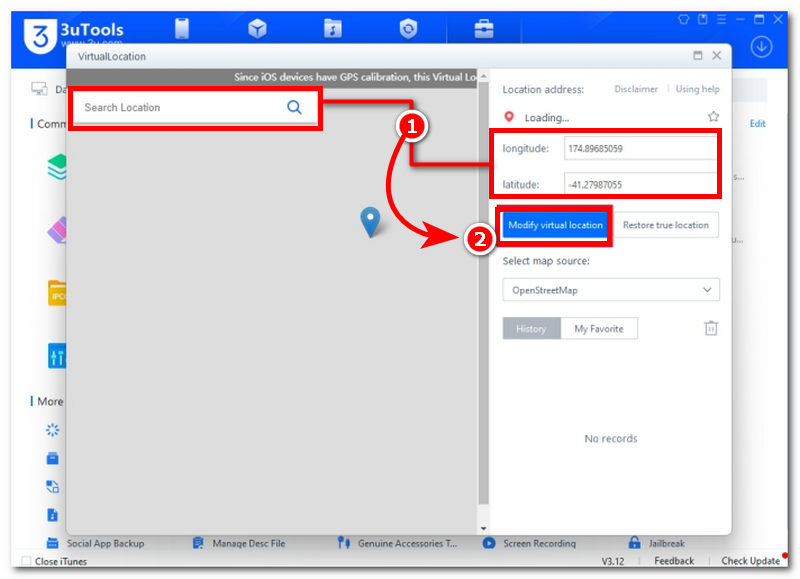 The virtual Location window will appear on your screen; from there, you can use the search bar functionality of the tool to search for a location you want your Pokemon GO to go to,o or you can just put the longitude and latitude coordinates of your chosen area. Once you have your area set up, click on the Modify Virtual Location button to finally have the virtual location saved to your iOS device.