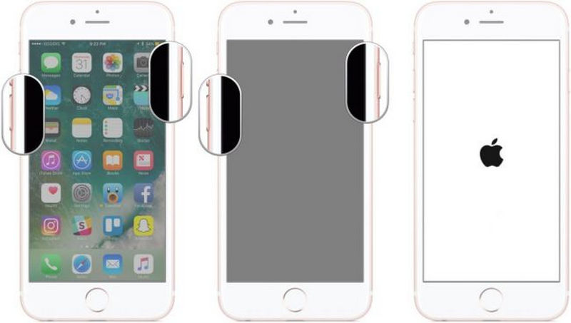 As the screen turns off, hold both buttons; continue holding them until the screen comes back on and displays the Apple logo.