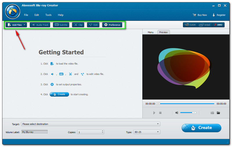In addition, it looks like vintage software, which is why Blu-ray Creator is unique. You can see the File, Edit, Tools, and Help on the upper left. Below it, you will also see the Add Files, Audio Track, Subtitle, Clip, Edit, and Preference.