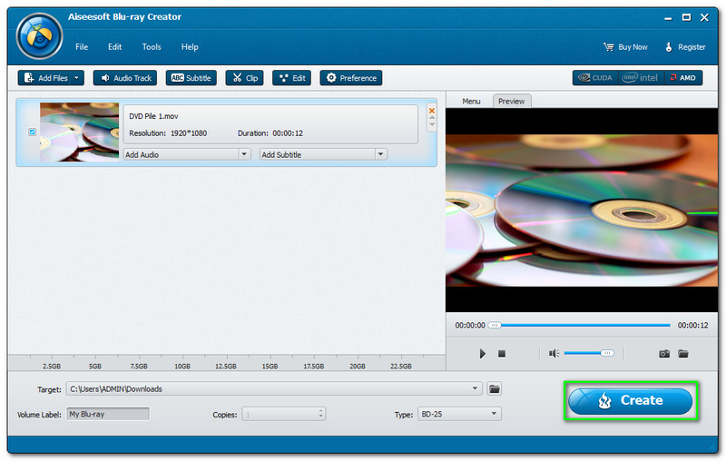In the right middle part, Blu-ray Creator provides a Menu and Preview where you can change the Template and view your file. Then, on the bottom, you will notice the Target, Volume Label, Copies, Type, and Create button.