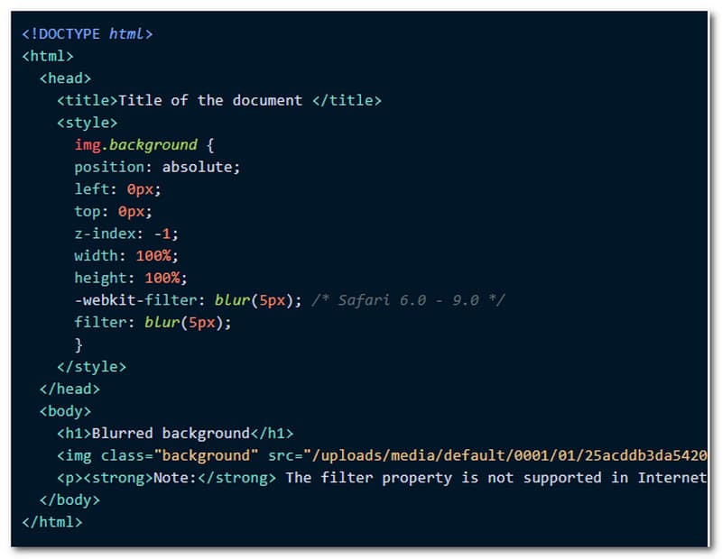Use the blur function to add a blur effect to the background picture. To make the stack order of the element and the element's width and height, use the z-index property. To position, the element concerning the closest positioned ancestor sets the position property to an absolute value. (filter: blur(px);