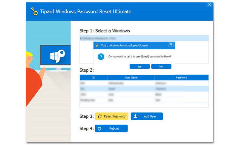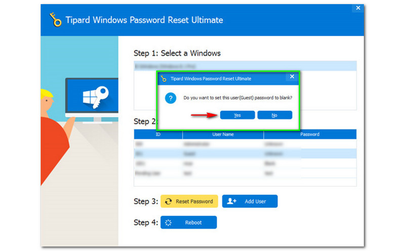After that, a rectangular box will appear and ask you to set the user password to blank. If you agree, you can tap the Yes button. If you disagree, tap the No button. Note that you cannot proceed to the next step once you choose the No button.