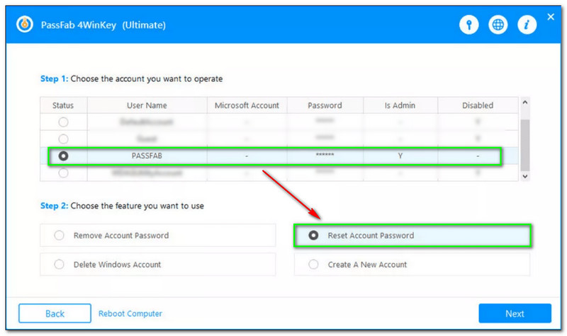 After clicking the PASSFAB, you can continue to the following table. On the bottom part, you will see the four available choices: Remove Account Password, Delete Windows Account, Reset Account Password, and lastly, Create a New Account. Now, click the Reset or Bypass Account Password. Then, click the Next button.