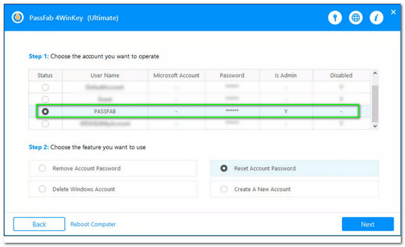 As you can see on the interface, PassFab 4Winkey allows you to select a Windows system. When you click the Next button, you will see all the accounts and choose what you like to operate.