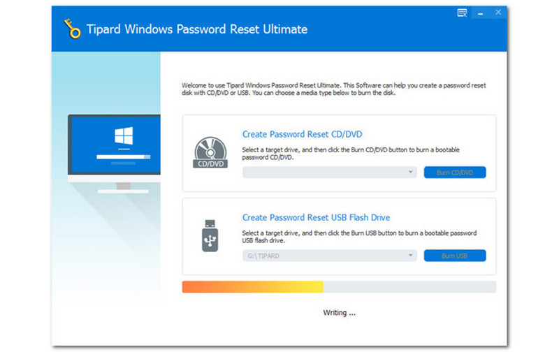 Tipard Windows Password Reset allows you to choose once you launch the software. You can choose Create Password Reset or Create Password Reset USB Flash Drive.