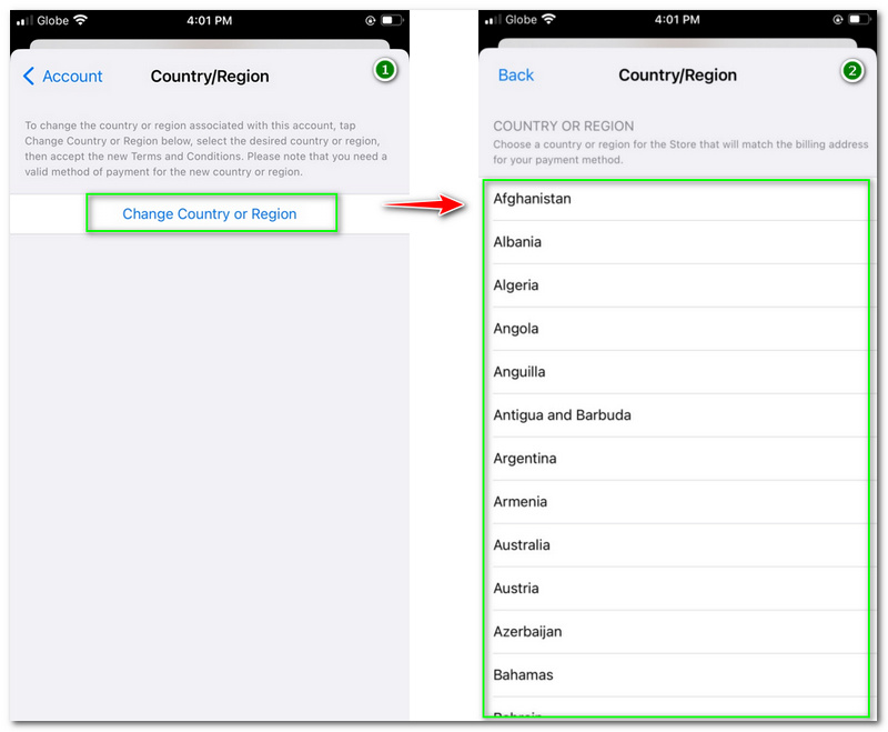 Afterward, you must sign in using your Apple ID and enter your passcode or fingerprint. Next, go to the Account Information, where you can see the Change Country or Region. Then, choose your new region or country. You must review all the Terms and Conditions of Apple and Agree to them. Lastly, enter or add new payment information, including your billing address, and continue using your iPhone.