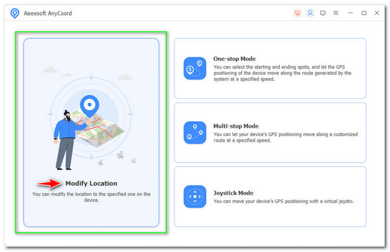 Supposing you already installed Aiseesoft AnyCoord on your computer. Now, launch it and choose the Modify Location. You will see that feature as the first option in the panel.