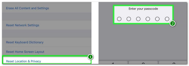 On the next screen, you will see the options like Reset Keyboard Dictionary, Reset Home Screen Layout, and Reset Location & Privacy. Select the Reset Location & Privacy. After that, iPhone will require you to enter your passcode.