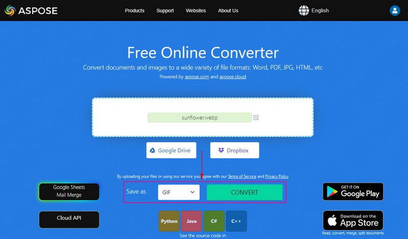 Aspose is a web-based online converter that offers fast and straightforward conversion that supports different file formats. It can upload and convert ten files simultaneously but only allow a maximum of 10 megabytes. The files you upload will stay on the platform for 24 hours, and after that, they are automatically deleted. It can convert DOC, PDF, JPG, PNG, SVG, TIFF, TXT, OTT, RTF, TAR, WPS, WEBP, GIF, and more. This platform can help you convert WebP to GIF with ease and hassle-free. To know how to convert WebP to GIF using Aspose, rely on the steps provided.