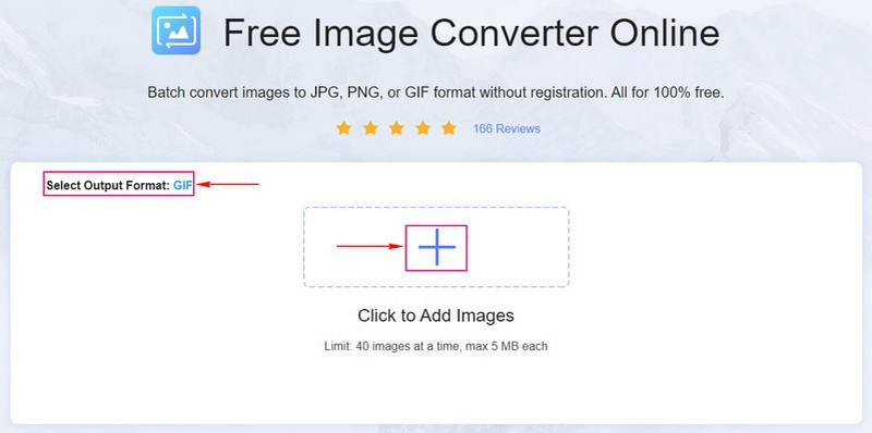 In the website’s main interface, click the Select Output Format, and change the JPG format into GIF format. Then, press the (+) icon on the middle part of the interface to add your WebP file to the online converter. Below the icon, you can see that you can upload forty images at a time, with a max of 5 megabytes for each file.