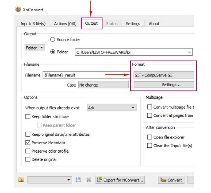 Next, head to the Output tab and select GIF as the output format. Also, enable the interlaced GIF 87a parameters for the resulting GIF. In addition, modify your image output preferences, whether to keep or delete metadata, remove the originals, preserve color profiles, and many more.