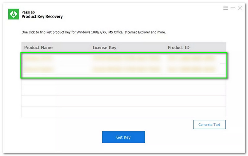Launch PassFab Product Key Recovery after the installation process, and you will see its main interface. You will also see a table in the middle part that includes the Product Name, License Key, and Product ID.