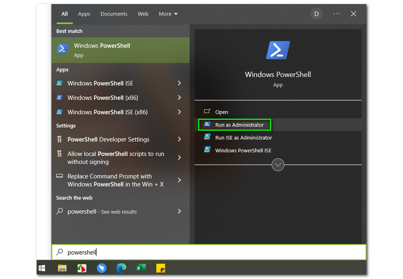 On the right side of the Windows Start, you will see other options such as Open, Run as Administrator, Run ISE as Administrator, and Windows PowerShell ISE. Then, select the Run as Administrator.