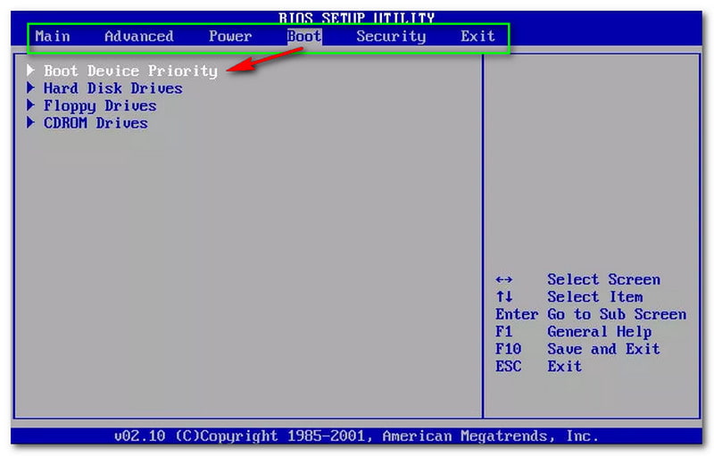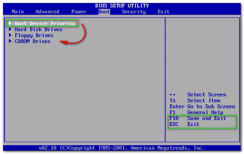 Next to that, you will notice the Boot Device Priority, and under that, you will also see the choice like Hard Disk Drives, Floppy Drives, and CDROM Drives. To Save and Exit, click the F10 key on your keyboard, and if you want to Exit only, click ESC.