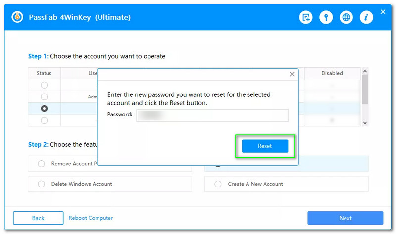 Next, a new panel will pop up, asking you to enter the new password you want to reset or recover the selected account. Now, type your new password on the typing box and click the Reset button.
