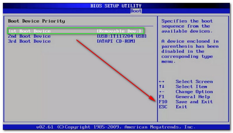After that, select Boot Device Priority, and you will see other options such as 1st Boot Device, 2nd Boot Device, and 3rd Boot Device. Select the 1st Boot Device - Removable Dev and press F10 to Save and Exit.