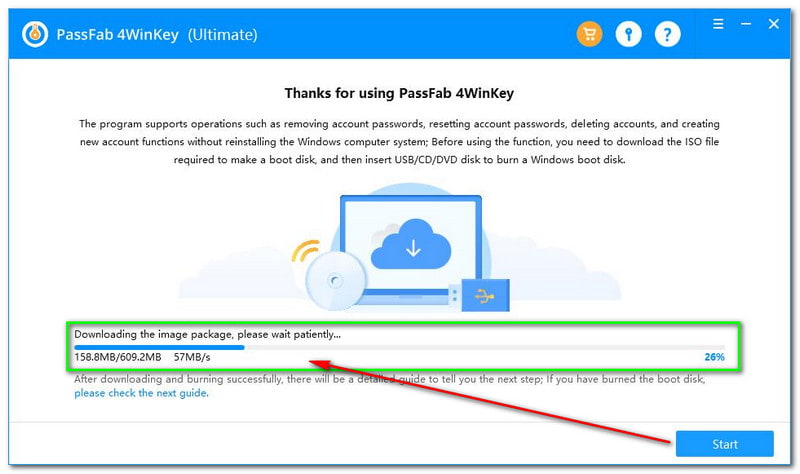 Next to that, tap the Start button on the lower part of the interface, and you will immediately notice the progress. In addition, you will also see the percent of the process with the loading bar. Then, wait for a moment to start creating a bootable disk.