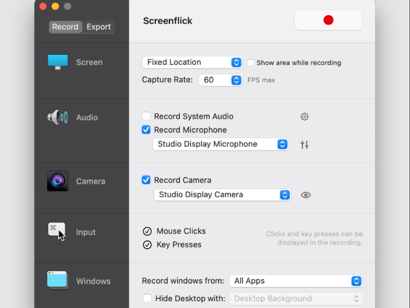 As you successfully download and launch Screenflick on your computer, you will see a simple and intuitive interface. In the Record tab, you can configure the following options: