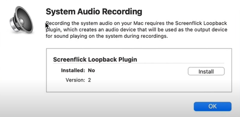 Audio: Screenflick supports recording the system audio and microphone audio. You can use the built-in microphone or a USB microphone attached to your Mac. However, to capture the system audio, you must install the Screenflick Loopback plugin first.