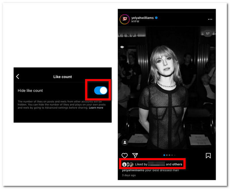 Toggle the Hide Like Count On to hide the number of likes on posts and reels from others.