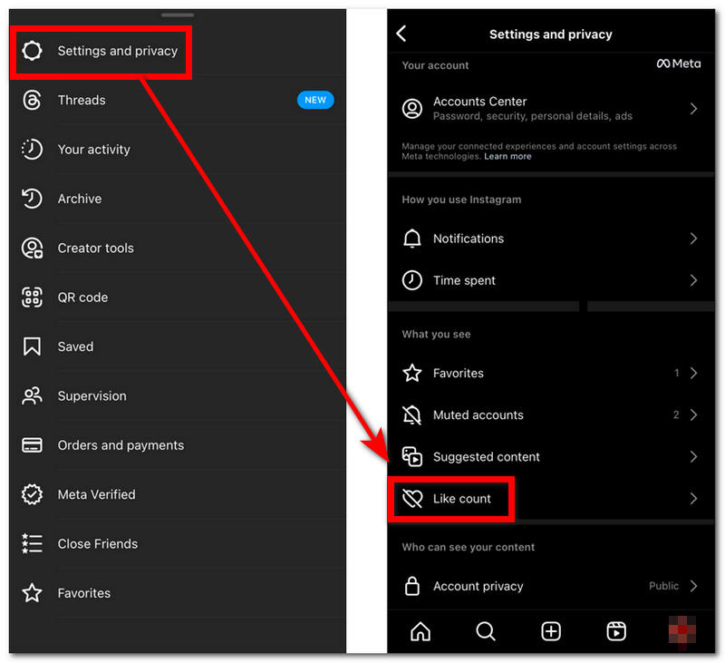 Go to Settings and Privacy, locate the Like Count tab, and click on it.